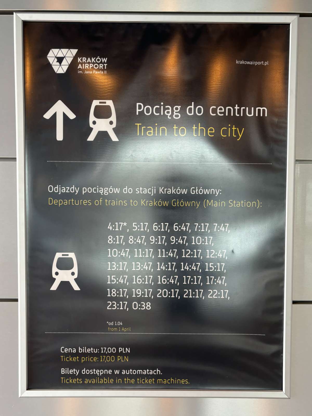 Dall’aeroporto al centro ci vogliono circa 17 minuti e il treno effettua 5 fermate prima di arrivare alla stazione centrale situata a pochi minuti a piedi dallo Stare Miasto, la città vecchia e centro storico di Cracovia. Il treno poi prosegue verso le miniere di sale di Wieliczka. Per ulteriori informazioni sugli orari aggiornati e le tariffe visita il sito web ufficiale della compagnia di treni Koleje Małopolskie.